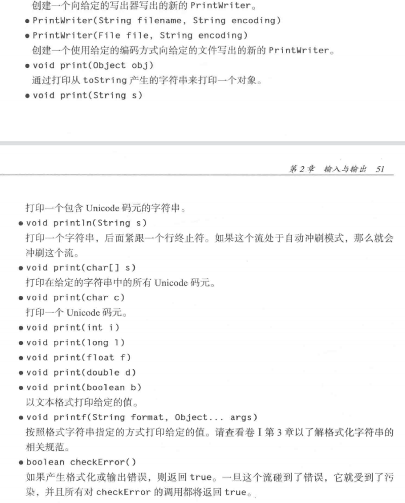 PrintWriter是一个打印写出器,其可以接受输出流、其它写出器、File对象、文件路径作为构建参数,PrintWriter的主要功能是使用print、printf、println方法向目的地写出文本。他和我们熟悉的System.out对应方法类似(System.out实际上是一个输出流),都是将传入参数转换成字符串(对于对象调用toStrin方法),调用println方法还可以在转换后的字符串尾添加一个换行符。在构建该写出器时可以指定一个布尔类型的可选参数autoBlush,选择在调用println方法时是否会自动冲刷缓冲区。