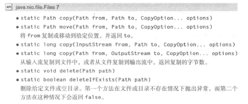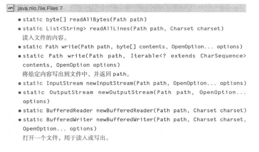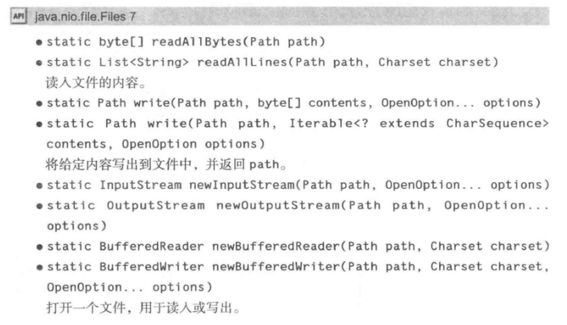 Files方法可以使普通文件的读写变得更快捷。Files方法可以很便捷的使用readAllBytes方法和readAllLines方法将一个文件的内容全部读取为一个字节数组或者字符串集合(每个元素是一行)。也可以使用write方法将数组或元素为CharSequence的集合写入文件。如果文件过大或不方便一次读写也可以根据文件返回输入输出流与带缓冲的读写器。