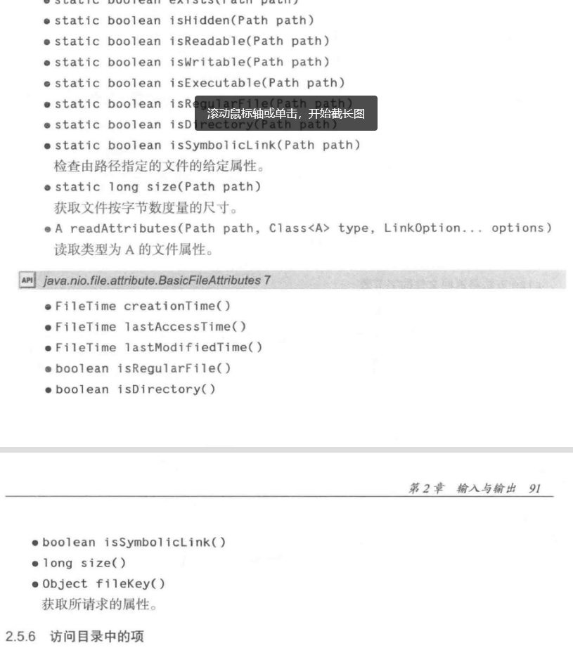 包括检查一个Path是文件、路径或者是符号链接,以及一些文件的属性,包括读写属性,是否存在,隐藏,文件的字节数,所有者等信息。同时,你也可以获取一个文件属性集对象,再通过该对象获取一些文件属性。