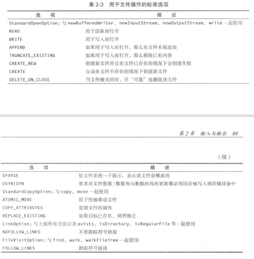 上述相关方法要求源Path必须存在,对于复制或移动操作,相当于把文件和目录从from复制或移动成to。删除操作同理,删除路径最后一级的文件/空目录。如果复制或移动时目标已经存在则将抛出异常,若想对其进行覆盖可以在参数列表最后指定REPLACE_EXISTING,若果想复制所有文件属性可以使用ATTRIBUTES参数,你也可以把操作定义为原子性的,参数为ATOMIC_MOVE,可以使用的参数列表如下: