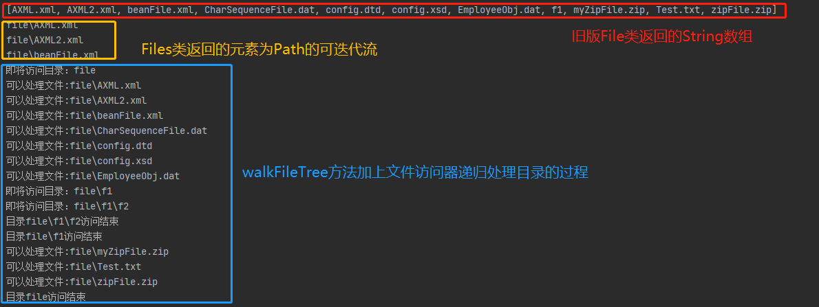System.out.println(Arrays.toString(list)); //旧的File类下访问一个目录下所有子项的过程,如果想递归遍历更深层,需要检查每一项字符串是不是目录