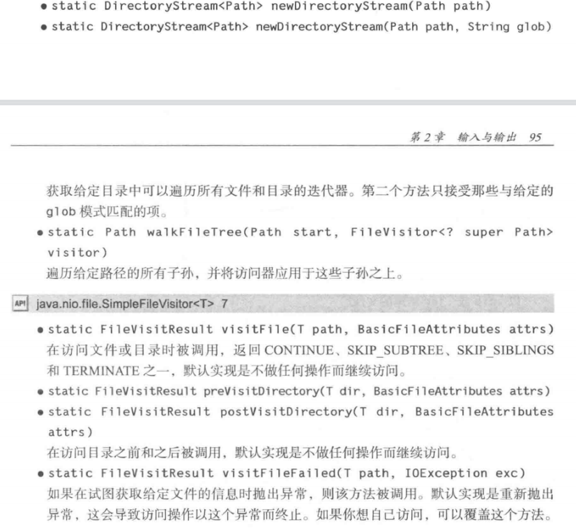 //如果想要访问一个目录下的所有子孙成员可以使用WalkFileTree方法并传入一个文件访问器(FileVisitor)对象,这个对象中的方法将响应访问文件时的不同阶段