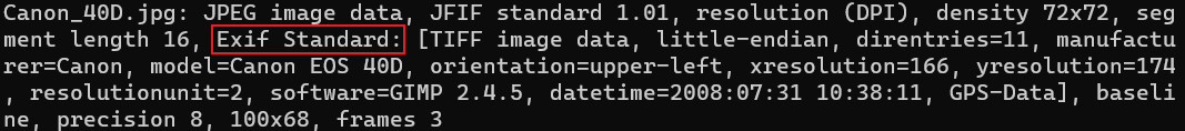 首先,我们需要一个正常的进行了Exif填充的JPEG文件。我在谷歌上搜索了“Sample JPEG with Exif”,然后找到了这个项目,接下来的测试使用的是 Canon_40D.jpg这张图片。