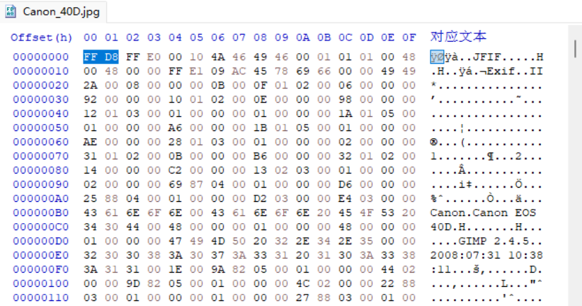 从前面引用的规范概述中可以知道的一件事是,所有 JPEG 图像都以字节值 0xFFD8 开头,以字节值 0xFFD9 结尾。前几个字节就是所谓的“魔术字节”,在 *Nix 系统上能通过这几个“魔术字节”识别文档类型。