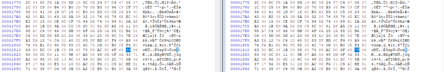 可以看到变更的字节,往下搜索可以看到其他变更点。