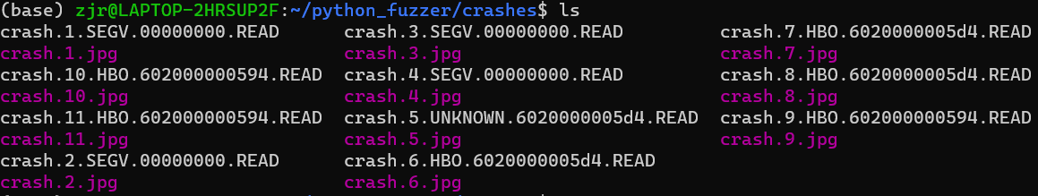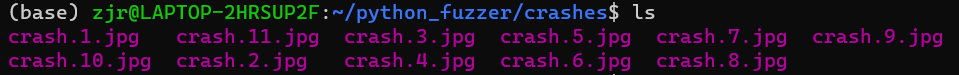 接下来创建一个叫做 crashes的文件夹,所有引发崩溃的图像都保存在里面,命名格式为 crash.<fuzzing iteration (counter)>.jpg,所以如果模糊测试的迭代次数是100的话,应该有一个文件 /crashes/crash.100.jpg。