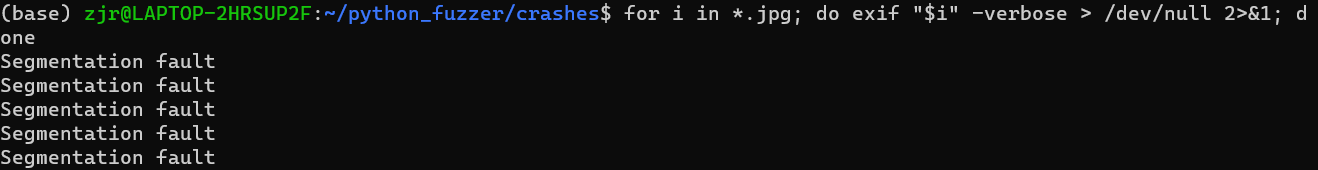 我们可以用一句命令测试该结果:for i in *.jpg; do exif "$i" -verbose > /dev/null 2>&1; done,注意,我们可以把STDOUT和STDERR重定向到 /drv/null上,因为段错误来源于命令行,而不是二进制文件。