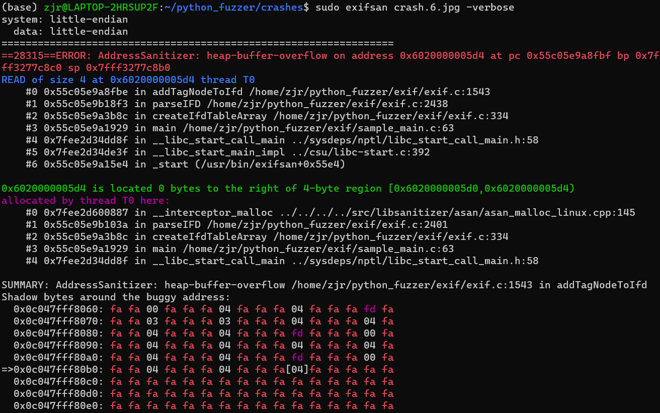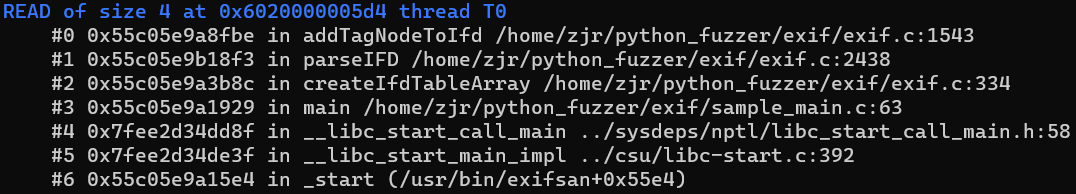 在这个输出结果中,我们不但获得了详尽的信息,ASan还对漏洞类别进行了分类,给出了崩溃发生的地址以及堆栈跟踪。可以看到,漏洞发生时,exif.c中的addTagNodeToIfd函数正在进行4字节读取操作。