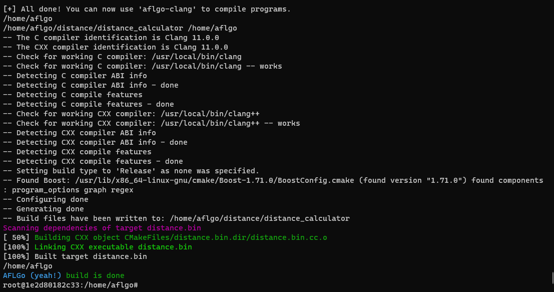 进入到容器里的home下,直接使用脚本安装aflgo,export是临时环境变量,每次fuzzing前需要进行设置。