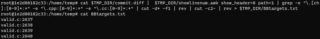 cat $TMP_DIR/commit.diff | $TMP_DIR/showlinenum.awk show_header=0 path=1 | grep -e "\.[ch]:[0-9]*:+" -e "\.cpp:[0-9]*:+" -e "\.cc:[0-9]*:+" | cut -d+ -f1 | rev | cut -c2- | rev > $TMP_DIR/BBtargets.txt