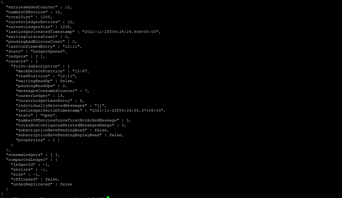 bin/pulsar-admin topics stats-internal my-topic (这里我使用的主题就是my-topic)