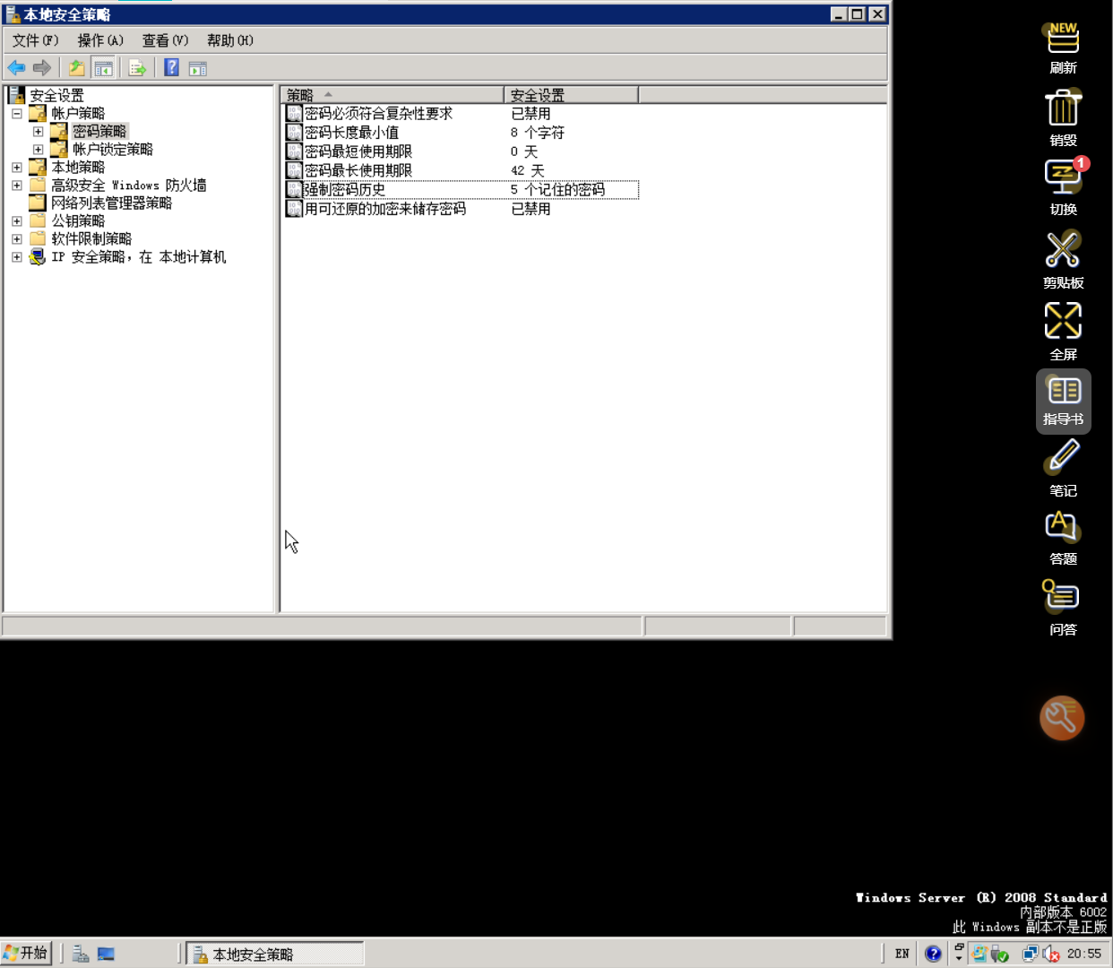 4.口令策略:开始->运行->secpol.msc (本地安全策略)->安全设置->账户策略->密码策略