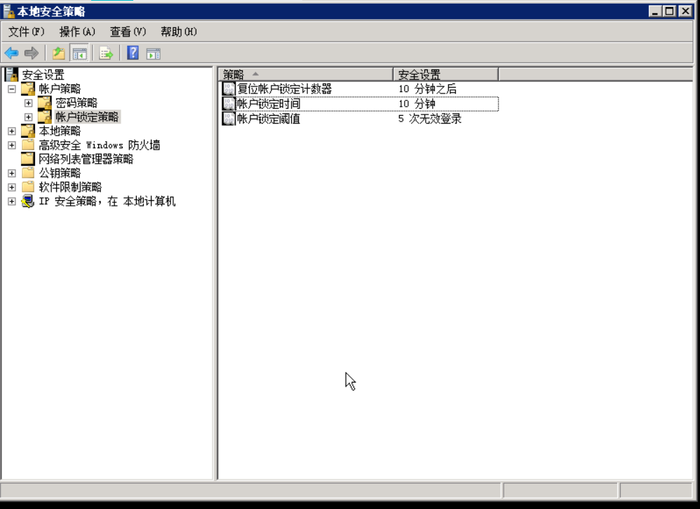 5.账户锁定策略:可以防止暴力破解的攻击方式,所以,很有必要设置账户锁定策略。开始->运行->secpol.msc (本地安全策略)->安全设置->账户设置->账户锁定策略