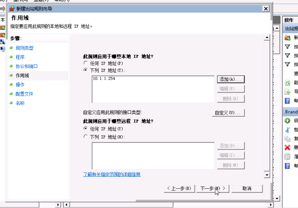 4)在“作用域”界面,点击“添加”,将弹出“IP地址”对话框,输入网址的IP地址,获取IP的方法为CMD 里ping tools.hetianlab.com,点击“确定”,回到“作用域”后,点击“下一步”。