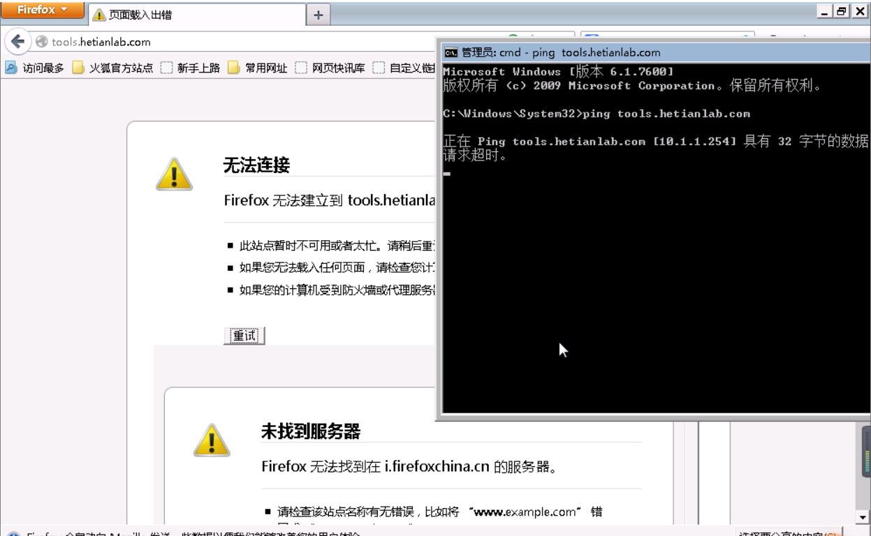 打开浏览器,此时已经无法访问http://tools.hetianlab.com。但可ping通。截图中返回了IP地址说明是通的,请求超时只是网站为了安全而设置的禁ping策略。