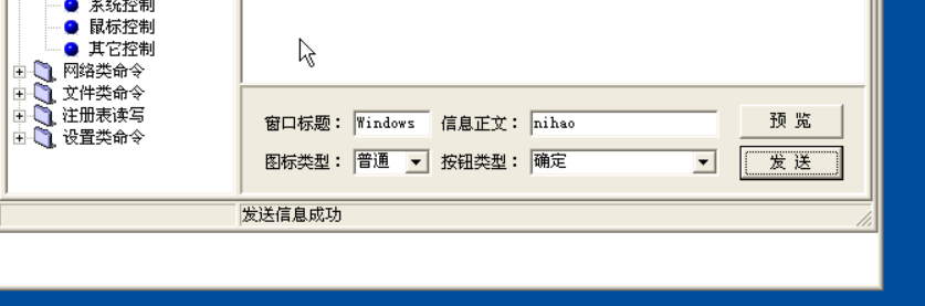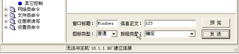 “发送信息”:这个功能可以使你向远程计算机发生Windows标准的各种信息,在“信息正文”中可以填入要发给对方的信息,在图表类型中,可以选择“普通”,“警告”,“询问”,“错误”等类型。按钮类型可以选择“确定”“是”“否”等类型。