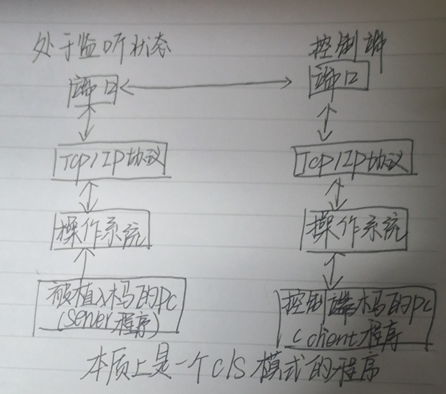 一般木马都采用C/S(client/server,即服务器/客户端)运行模式,因此它分为两部分,即客户端和服务器端木马程序。其原理是,当服务器端程序在目标计算机上被执行后,一般会打开一个默认的端口进行监听,当客户端向服务器端主动提出连接请求,服务器端的木马程序就会自动运行,来应答客户端的请求,从而建立连接。第一代和第二代木马就采用这种方式。