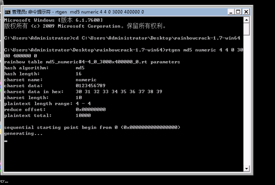 2.以攻击者的视角,通过生成相应的彩虹表来对4位数字密码MD5密文进行破解。