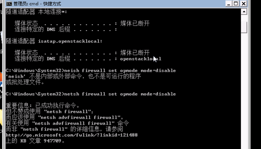 2.为了更好的演示攻击win7系统实例需要关闭win7系统的防火墙,win+R输入cmd,运行“netsh firewall set opmode mode=disable”命令