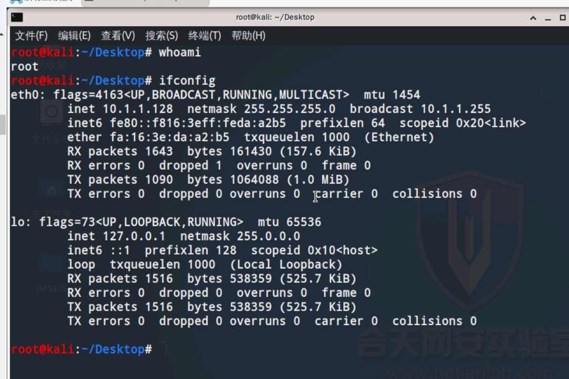 3.查看攻击者主机登陆用户及网络配置信息,从下图3可以看出攻击主机登陆用户为root ,IP为10.1.1.128
