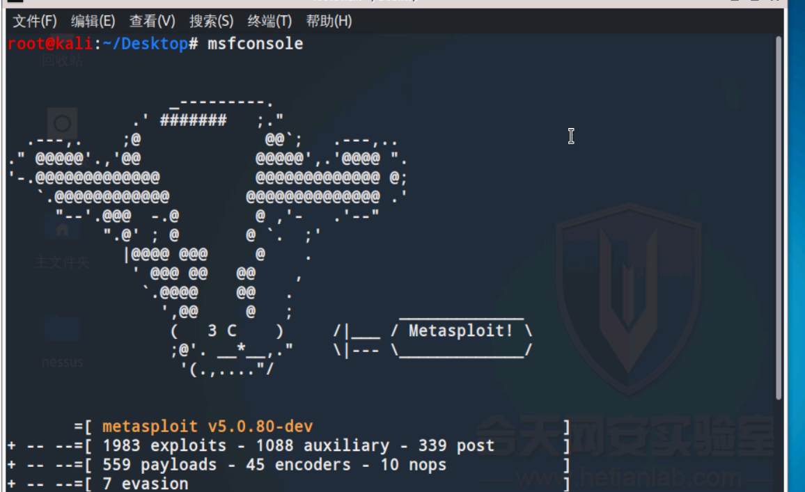 10.运行命令“exploit”开始进行攻击,生成恶意网页和做好其他准备,只等受害者访问我们构造的恶意网页
