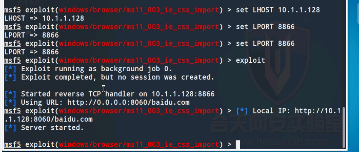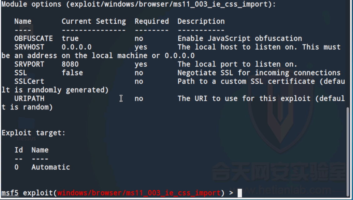 步骤二中扫描得到win7主机系统存在MS11_030解析漏洞,但是该漏洞利用条件较为苛刻,因此选择MS11_003 IE CSS Import漏洞来演示如何通过诱骗攻击者点击我们精心构造的含有攻击代码的网页来实现系统入侵。