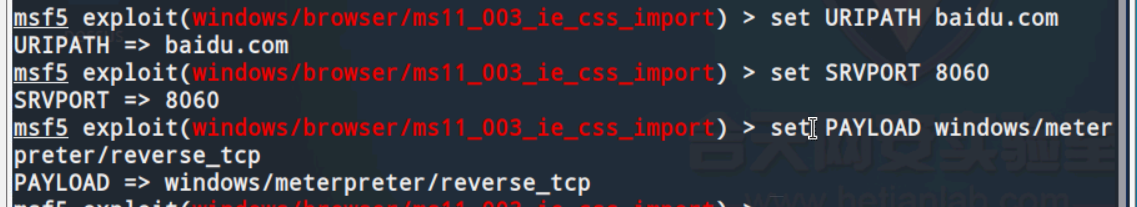 2.运行命令:“use exploit/windows/browser/ms11_003_ie_css_import”选择漏洞利用EXP