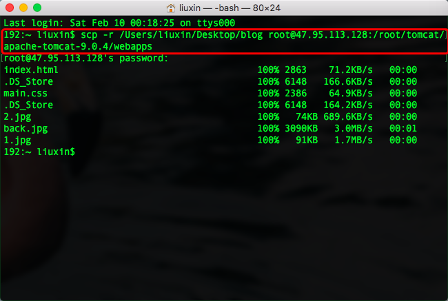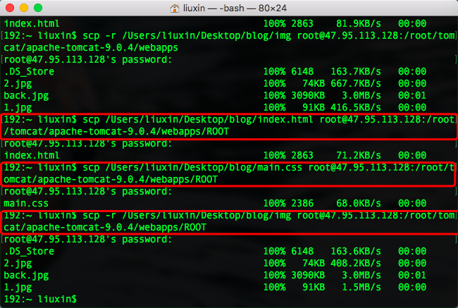 再次打开一个新的终端,上传我们准备好的文件,命令同上,不同的是,这次放在ROOT下