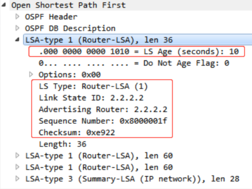 chksum相同,则判断LS age(老化时间)是否等于3600s,等于3600s最新
