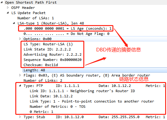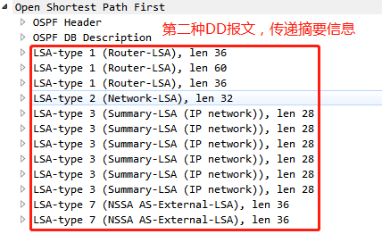 DD报文:携带LSDB所有LSA的摘要信息;摘要信息包括:type、Ls id、Advertising Router、ls age(老化时间)、seq(序列号)、chksum(校验和)等信息