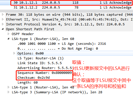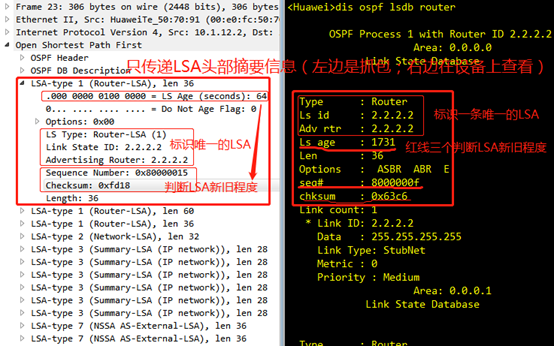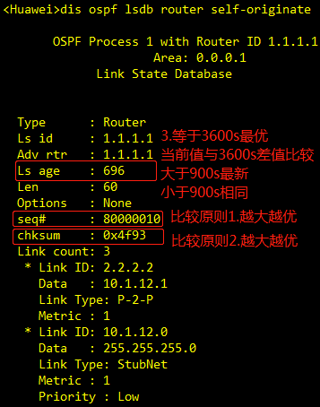 用于判断LSA的新旧(seq(序列号)、chksum(校验和)、ls age(老化时间)三个参数判断新旧程度)