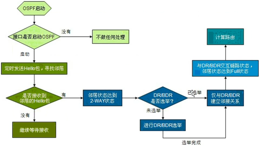 收到含有自己router id的hello包进入2-way状态,建立邻接关系;根据网络类型选举DR/BDR