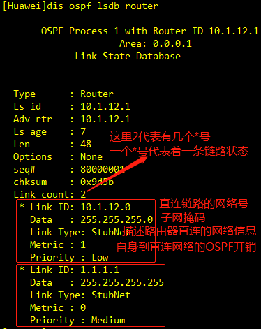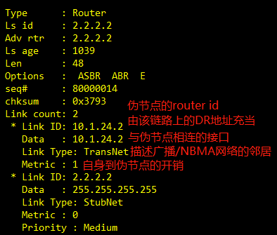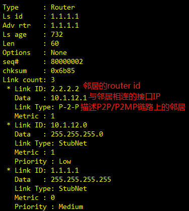 1类LSA的链路状态由4种组成link type来进行描述;Stubnet(描述自身直连的网络号/掩码)、p-to-p(描述点对点、点对多点链路邻居)、transnet(描述广播/NBMA链路上的邻居)、virtual(描述虚链路)