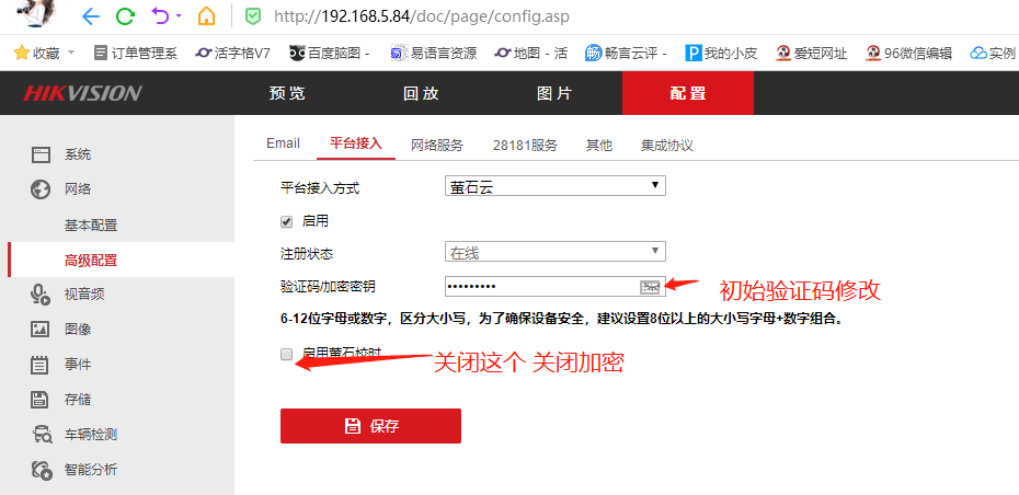 3.网页打开录像机高级配置,勾选萤石云,第一次用要更改验证码。汉南厂是qq1234567 ,下面加密不要勾选,不然不能发布成m3u8格式,然后登陆网页萤石云开发者中心生成不需要app就可以观看的链接