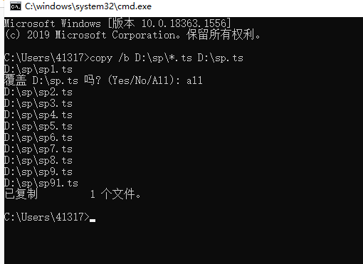 copy /b F:\video\00\20230414\1700-1800\*.TS D:\sp10.ts