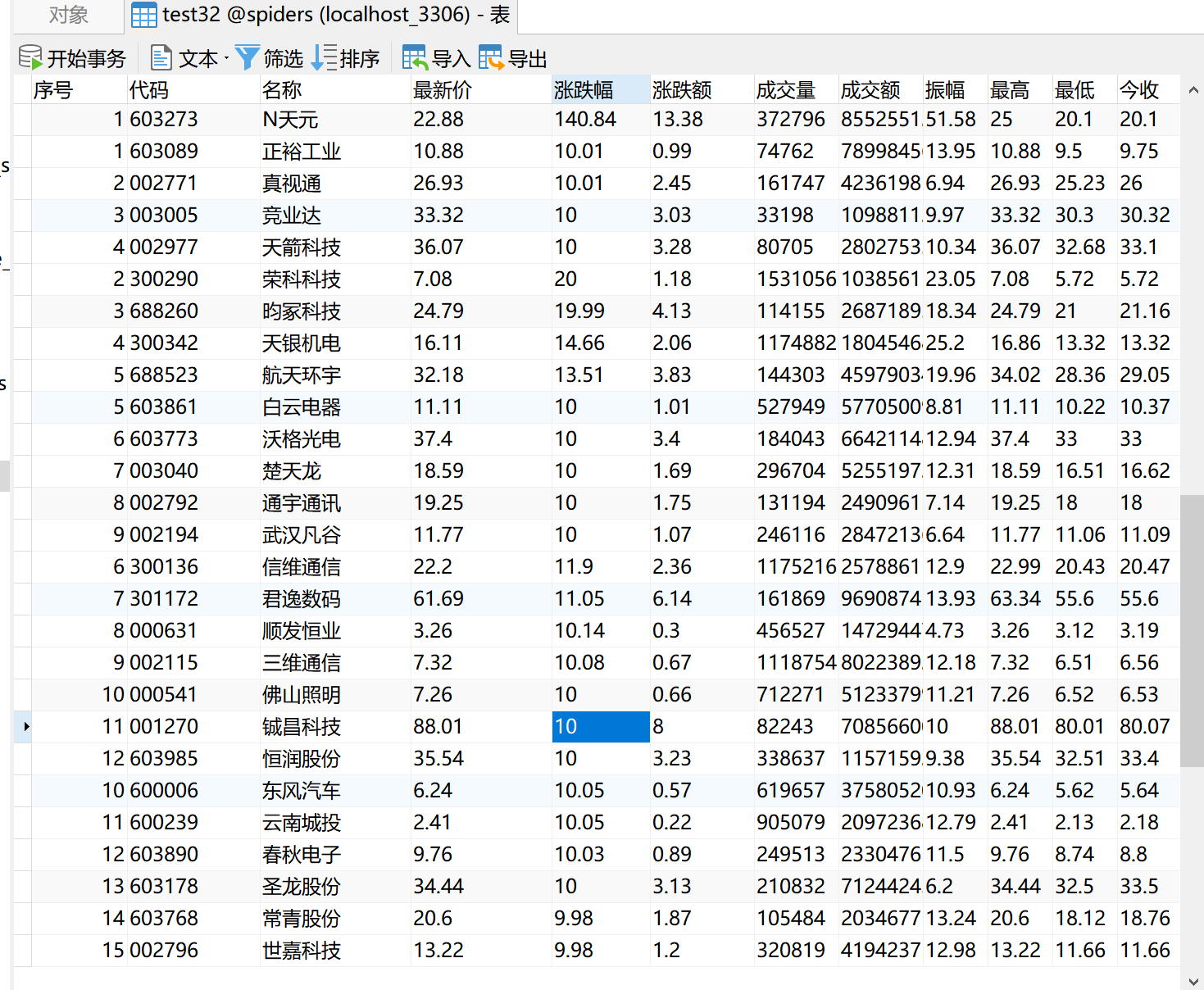 sql = "INSERT INTO test32(序号,代码,名称,最新价,涨跌幅,涨跌额,成交量,成交额,振幅,最高,最低,今收,昨收)" \