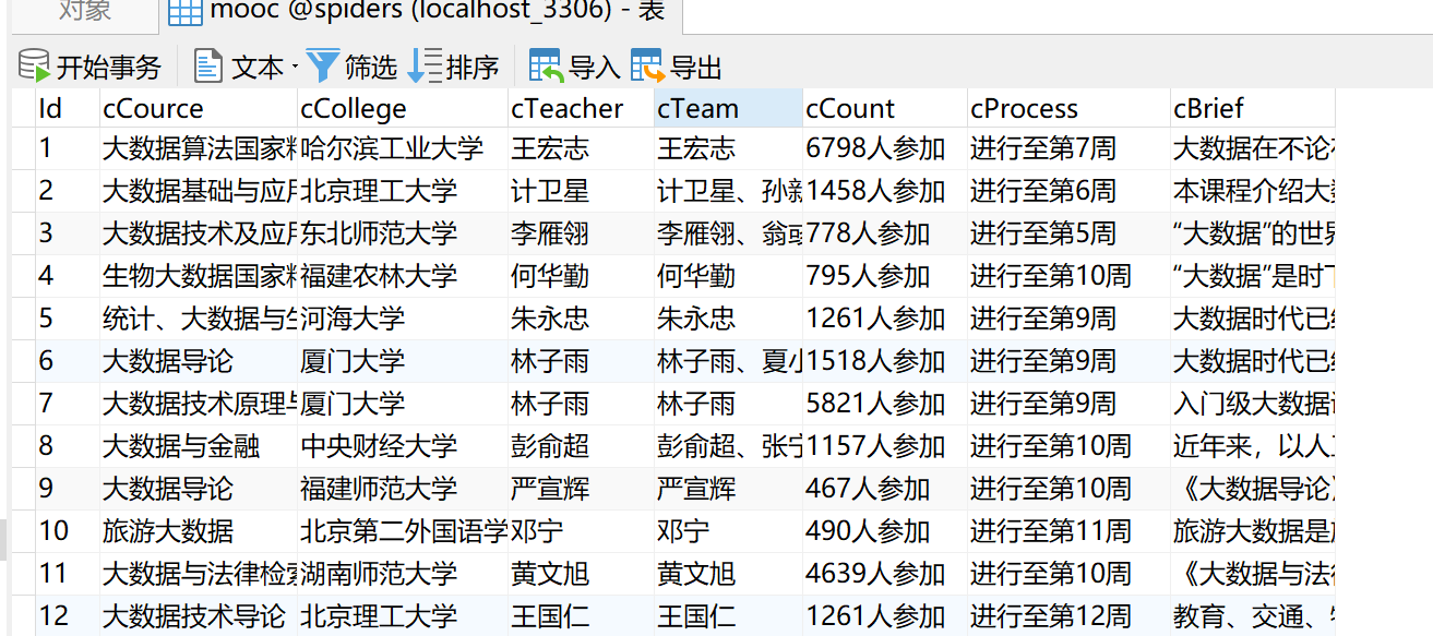 sql = '''CREATE TABLE mooc(cCourse varchar(64),cCollege varchar(64),cTeacher varchar(16),cTeam varchar(256),cCount varchar(16),