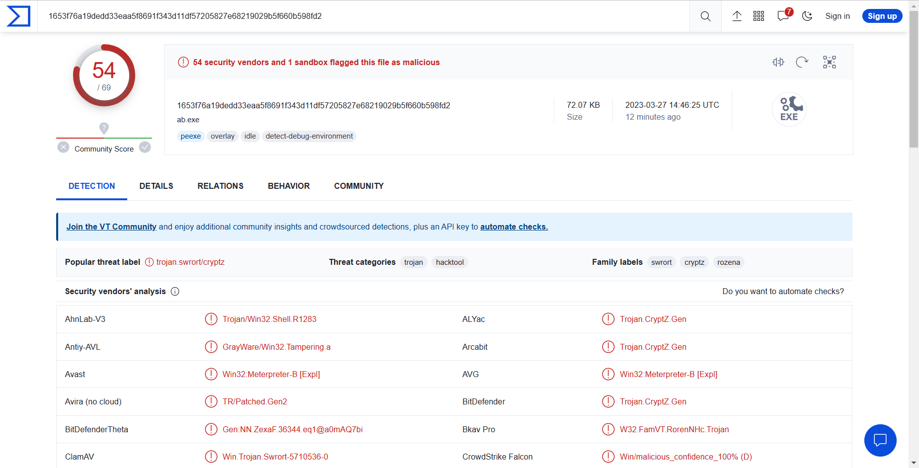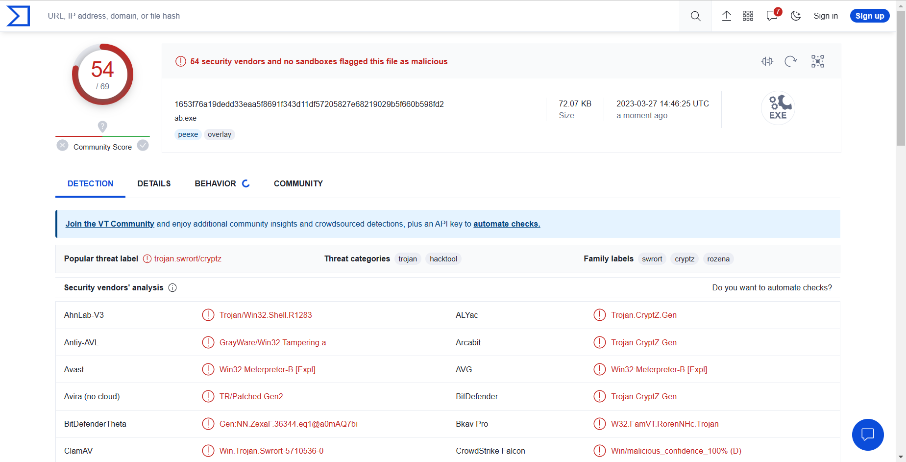 - 可见,69个杀毒软件仍有54个可以检测出来。