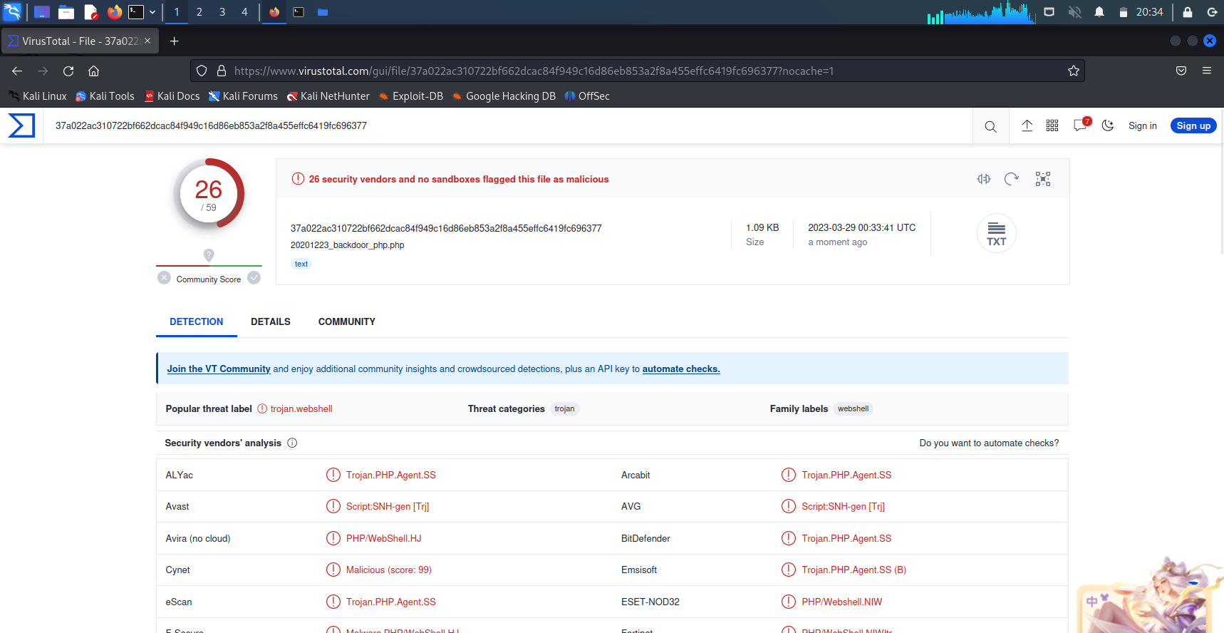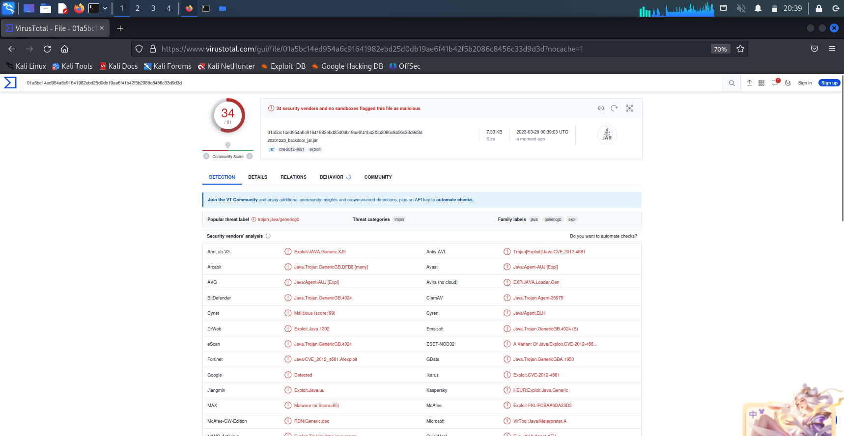 - 在本次实验过程中,我最开始卡在了生成php和jar文件之后,准备virustotal检测时,找不到文件的生成路径。最后,我在虚拟机里找到了上次实验中生成的backdoor文件,以此找到路径,接着在虚拟机里的浏览器里使用virustotal,进行检测。