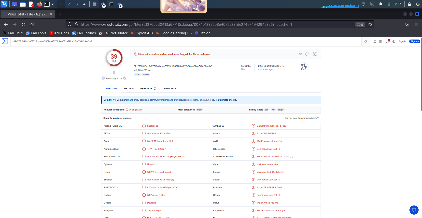 - 检测实验二中生成的后门程序,使用使用VirusTotal进行扫描,扫描结果如下