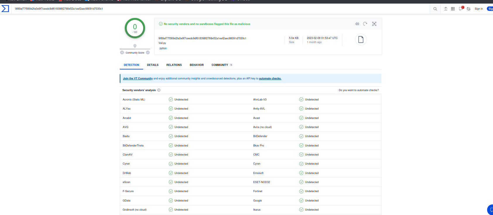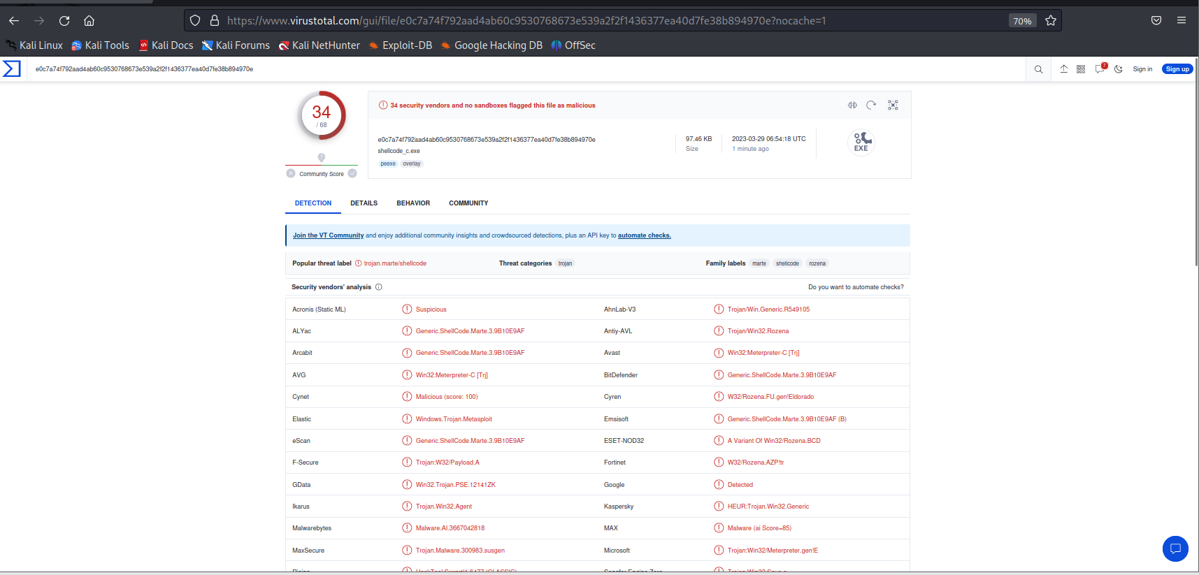 - 此时我们再在VirusTotal上检测一下生成的文件。