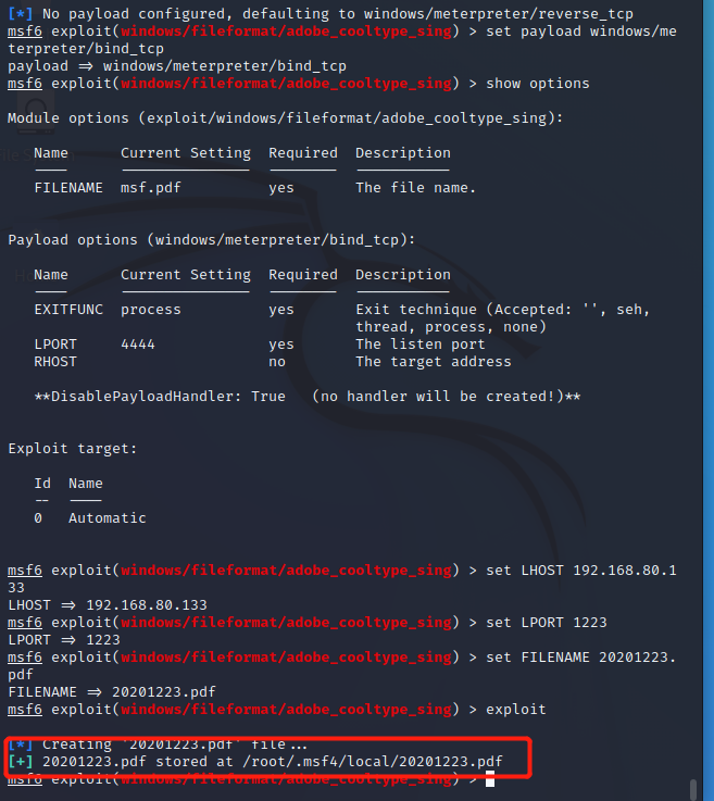 use windows/fileformat/adobe_cooltype_sing //选择攻击模块