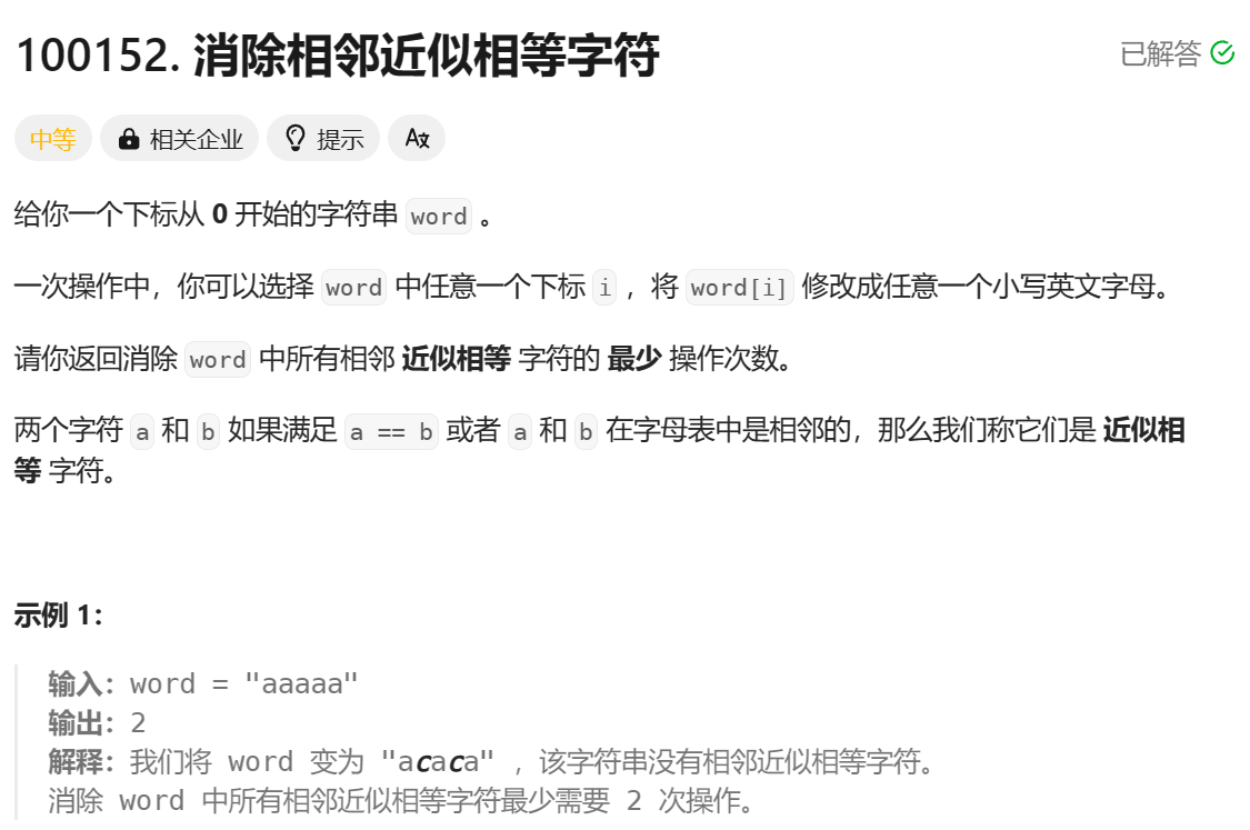 class Solution: def removeAlmostEqualCharacters(self, word: str) -> int: res = 0 n = len(word) i = 1 while i < n: if abs(ord(word[i - 1]) - ord(word[i])) <= 1: res += 1 i += 2 else: i += 1 return res